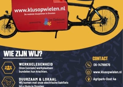 Het moederbedrijf In Opbouw heeft meerdere leer/werk bedrijven gecreëerd. Dit varieert van een houtwerkplaats tot fietsmaker. Het is onze missie om mensen die wat afstand hebben tot de arbeidsmarkt wederom in hun kracht te zetten middels gewaardeerd werk. Ons bedrijf heeft een plekje midden op de campus van de Agrarische Hogeschool in Dronten. Er leven om ons heen zo’n 2500 studenten en arbeidsmigranten. Zij hebben behoefte aan mobiliteit, eten en een klusjesman. Daar willen wij in voorzien. Maar we zijn er ook voor u.